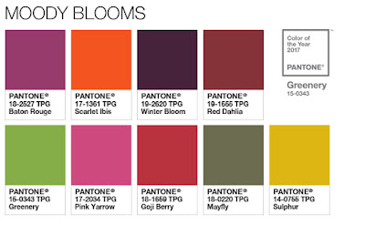 You can find a lot of different palettes on the Pantone website to help inspire you to coordinate colors either for decorating or for fashion. I noticed that the following palette, Moody Blooms, included several colors that were in my fabric. They may not be an exact match, but they are pretty close.